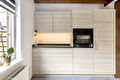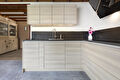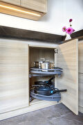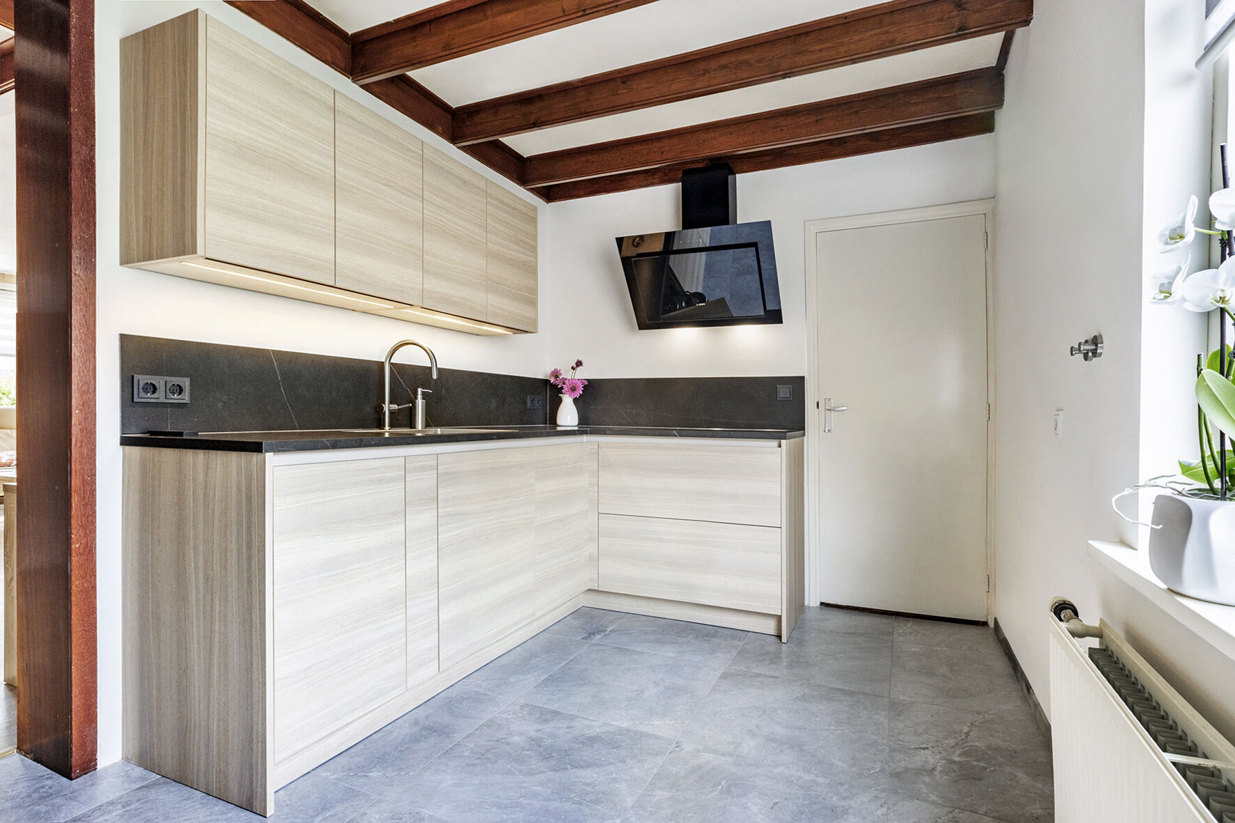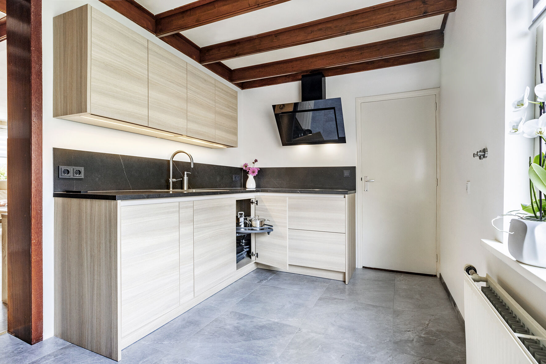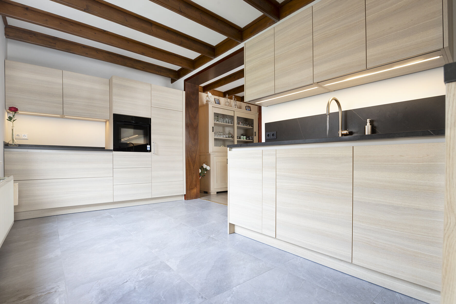 De keukenfronten, uitgevoerd in blond eiken en greeploos design, zorgen ervoor dat de keuken een moderne uitstraling krijgt.