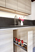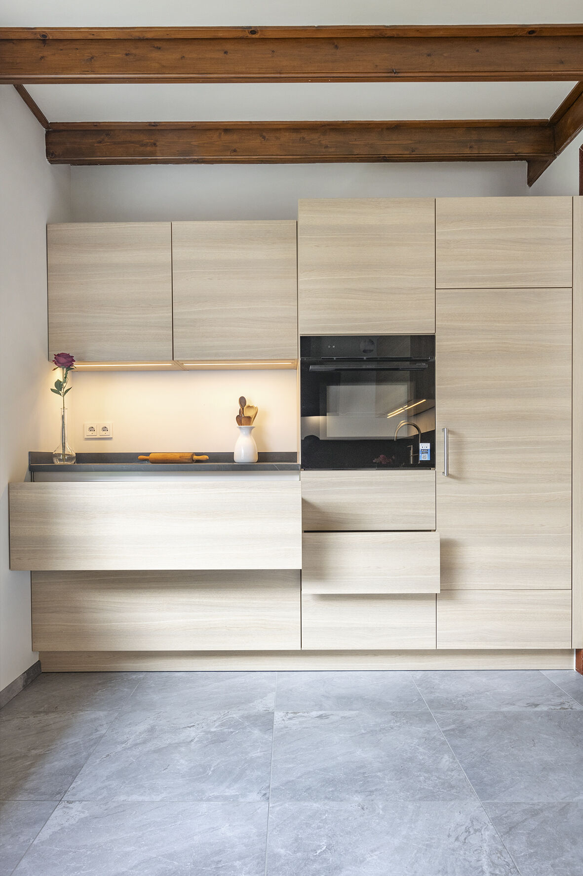 Het kloppende hart van deze keuken is het indrukwekkende Neolith 60924 Calatoroa werkblad. Met zijn elegante uitstraling, duurzaamheid en praktische eigenschappen is het niet alleen een prachtig werkblad, maar ook een functioneel werkoppervlak.