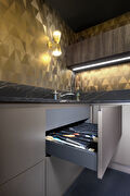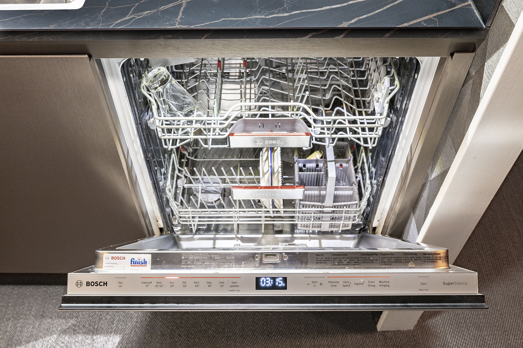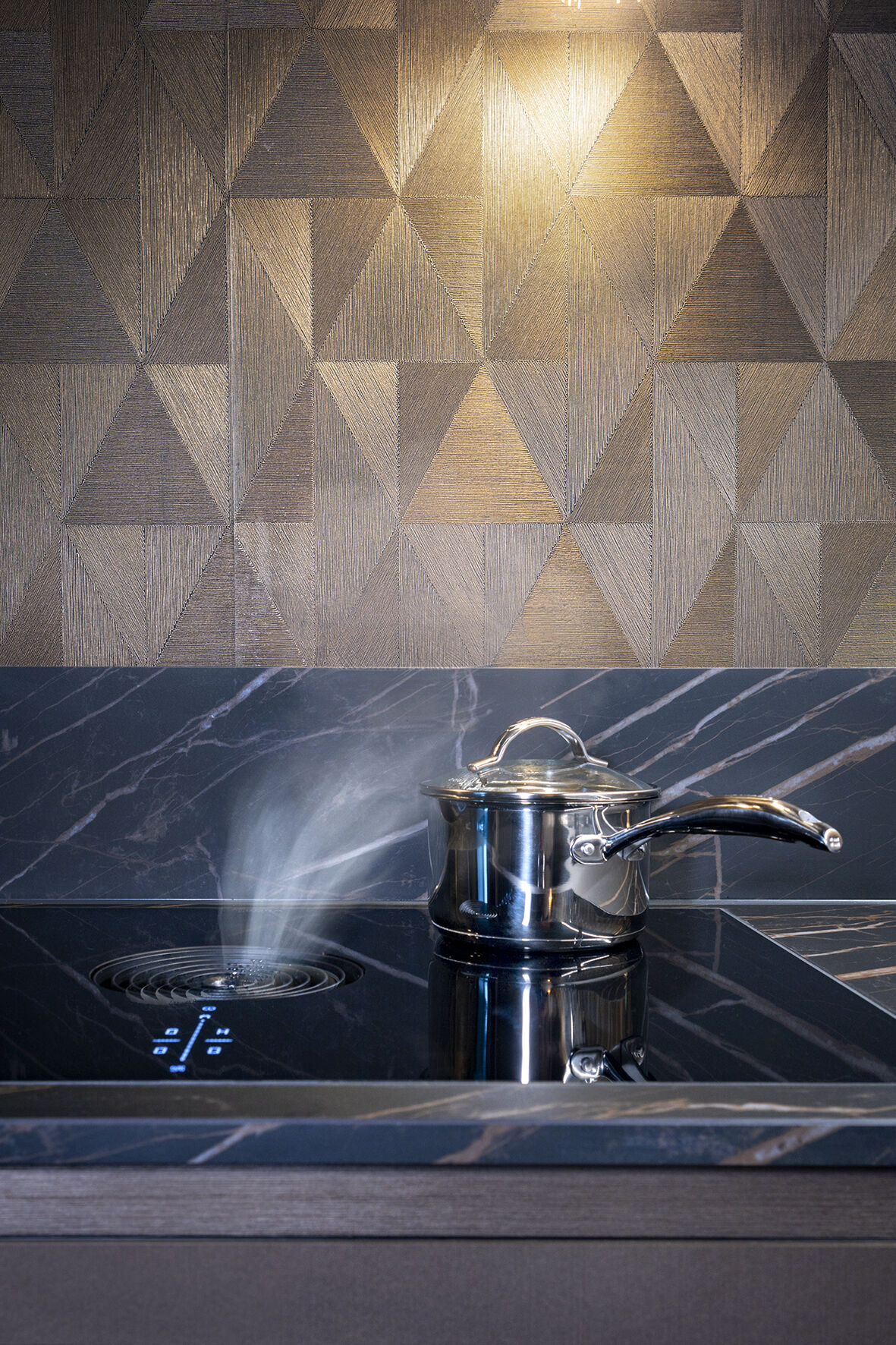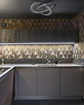 Het werkblad is gemaakt van keramiek, wat niet alleen elegantie uitstraalt, maar ook bijzonder praktisch is. Het materiaal is krasbestendig, hittebestendig en vlekbestendig, dankzij de hoge dichtheid van het materiaal. De marmerlook van het werkblad zorgt ervoor dat de warme tint ook in het donkere blad wordt verwerkt. De combinatie van deze materialen zorgt voor een verfijnde en exclusieve uitstraling van de moderne keuken in Scheemda.