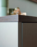 Het eiland is voorzien van een verhoogde bar. Hierdoor ontstaat een duidelijke scheiding tussen het kookgedeelte en de zitplek. Dit verhoogde deel is uitgevoerd in een warme houttint, wat een mooi contrast geeft met de rest van de keuken.
