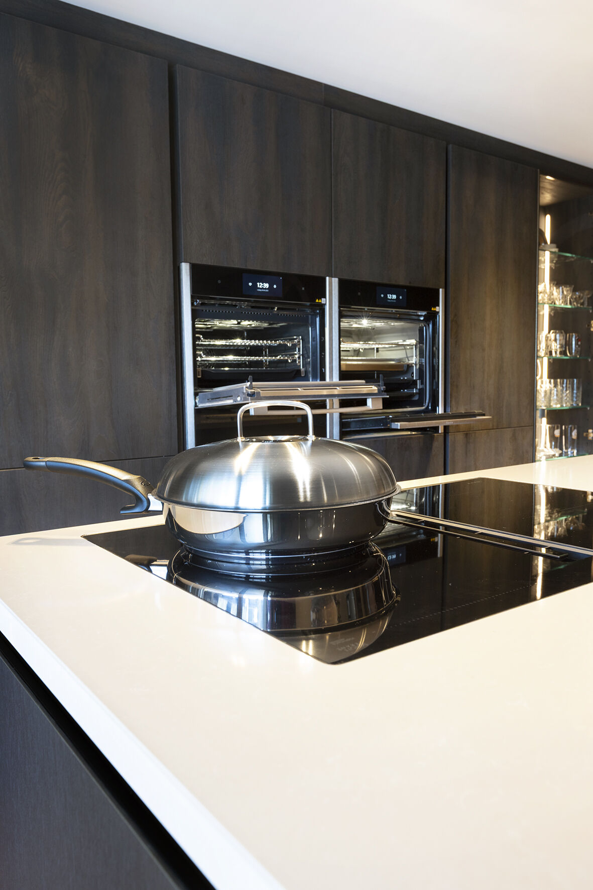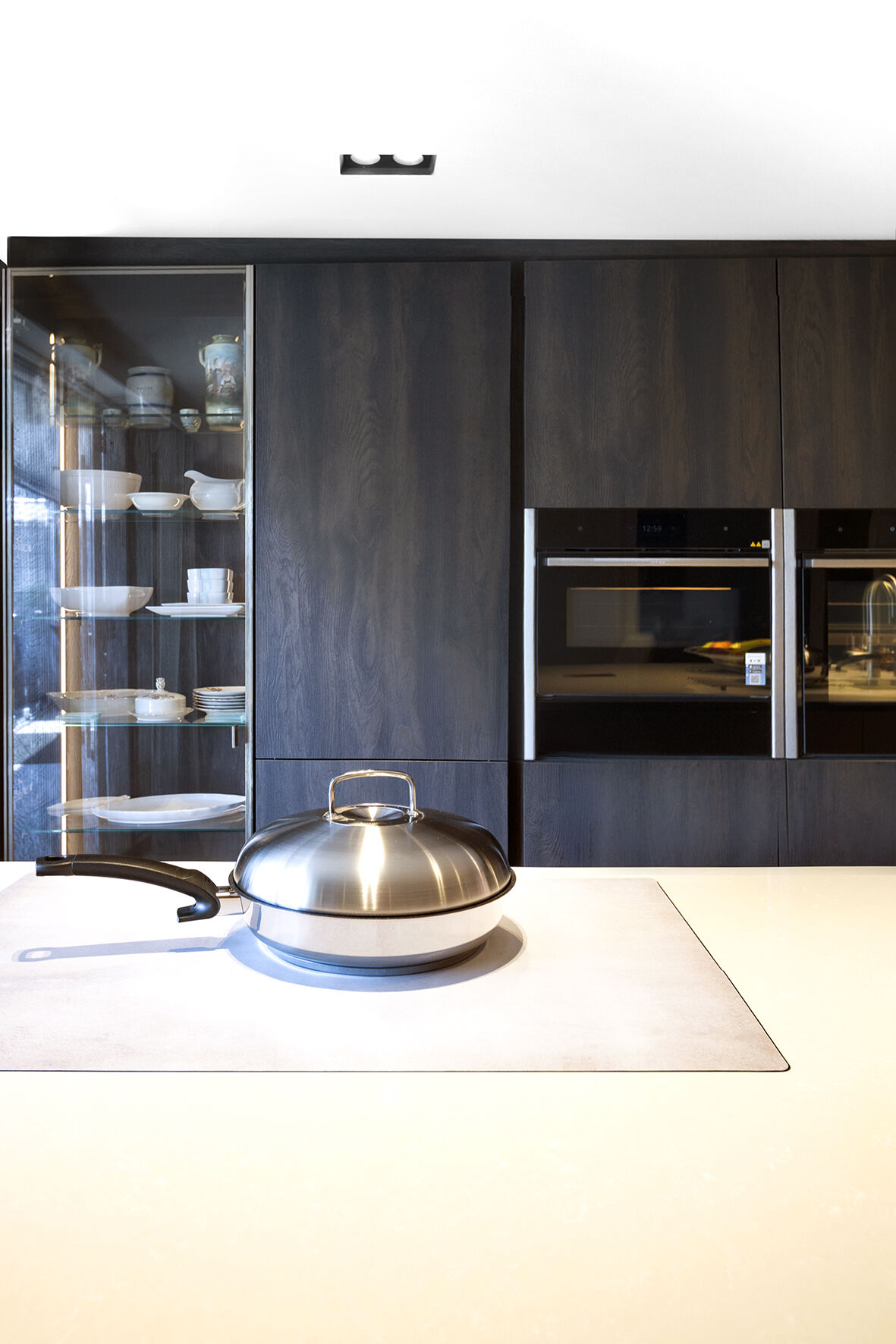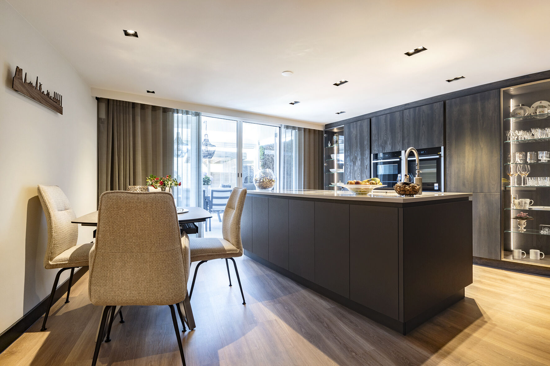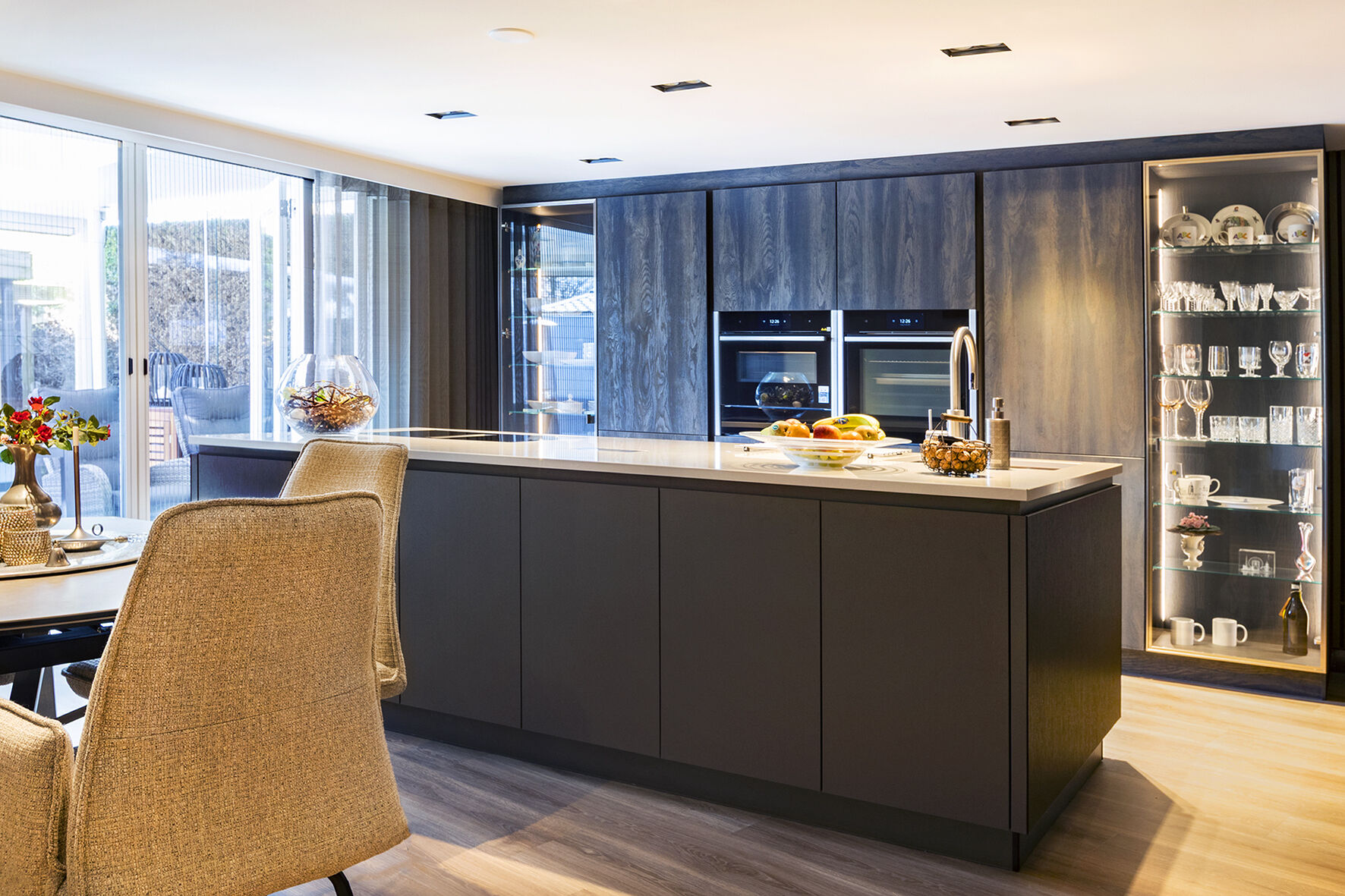 Het ontwerp van de keuken ontstond in samenwerking met de familie, die zich liet inspireren door één van onze showroomkeukens. We hebben hun ideeën verder uitgewerkt en aangepast om een unieke, op maat gemaakte keuken te creëren. Omdat de keuken zich in een ruimte bevindt met veel natuurlijk licht door de grote pui, kozen we voor een donker front in de kleur Pronorm YVC Brown Steel in combinatie met een licht werkblad in de kleur Cosmostone Beige Nuvoloso Glans. De hoge kasten werden uitgevoerd in het Blackwood front van Pronorm, terwijl de glaskasten een chique brons kleur kregen, dit geeft een luxe en moderne uitstraling aan de ruimte.