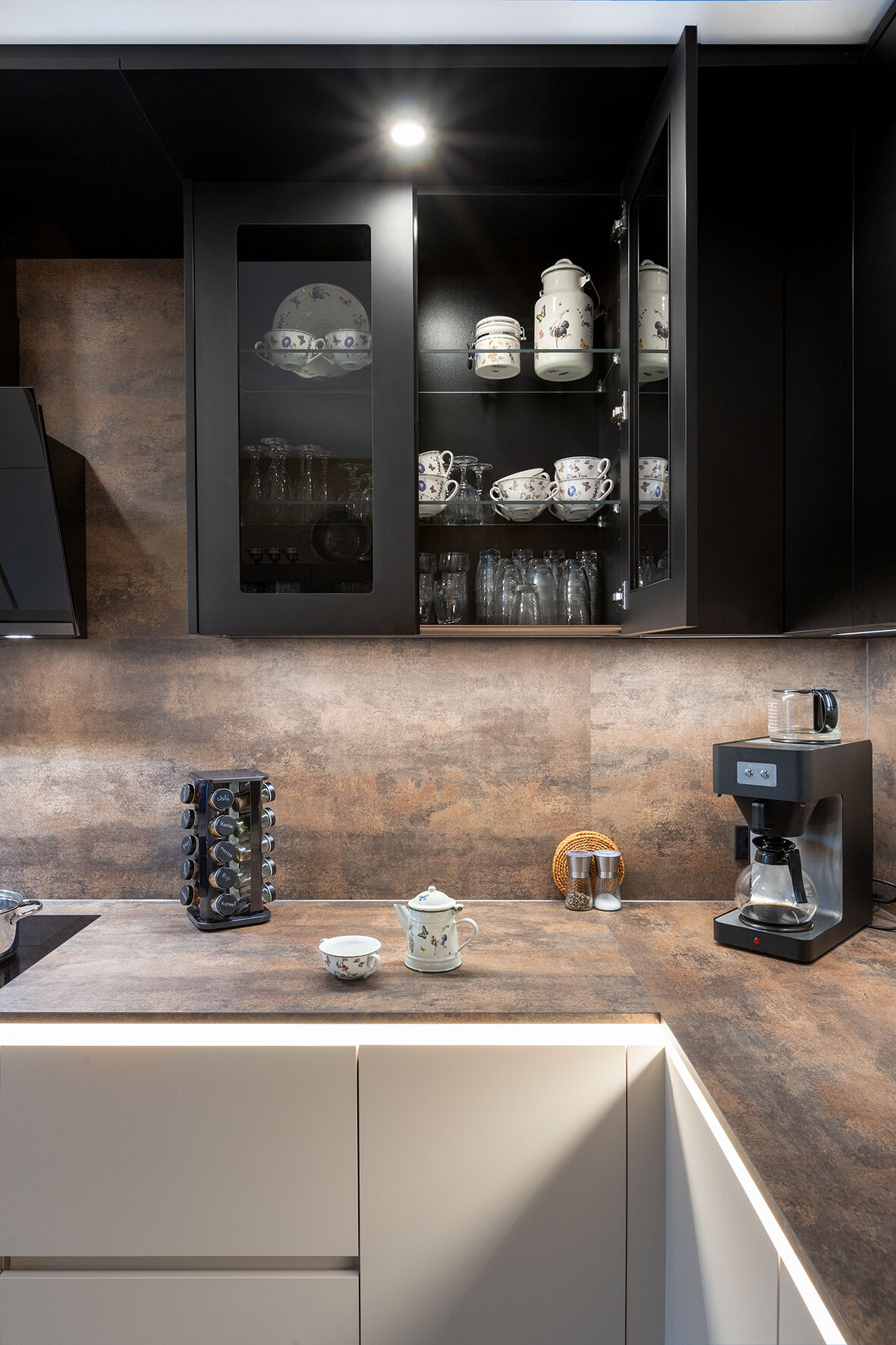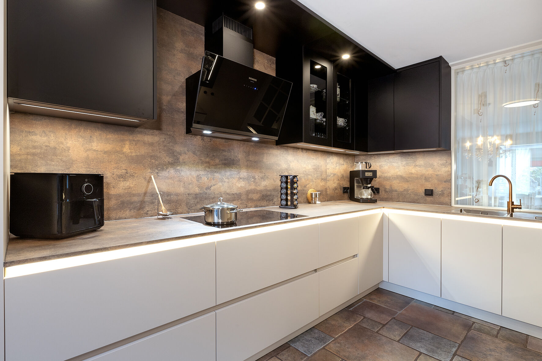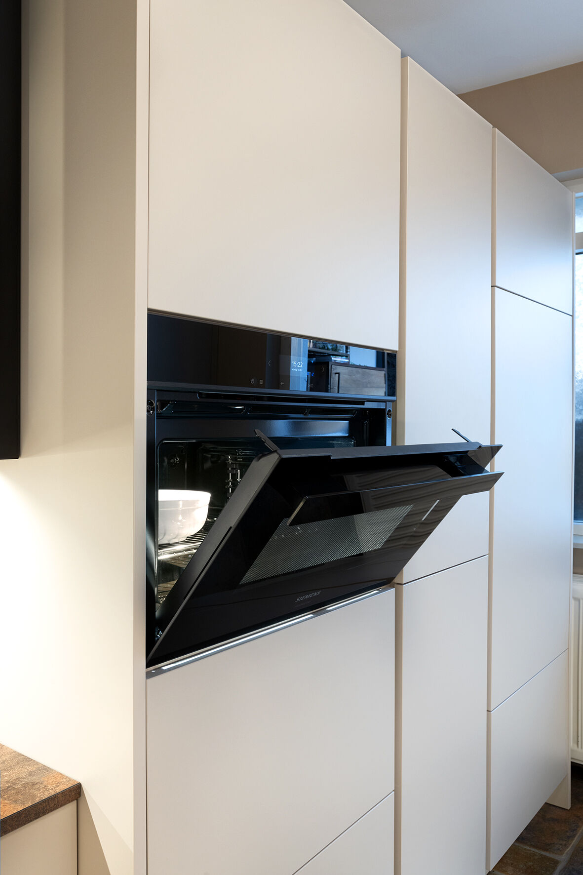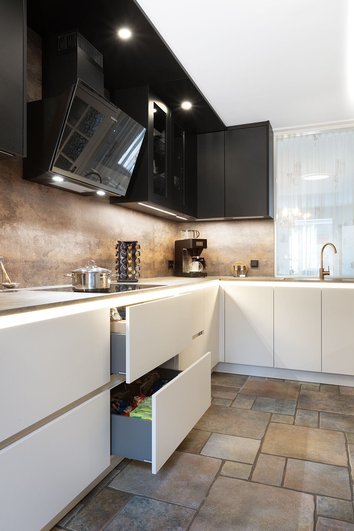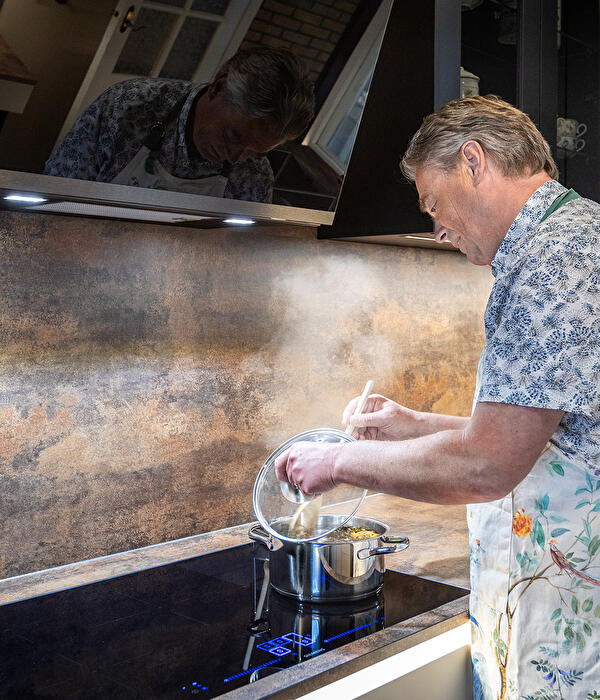 Om inspiratie op te doen, bezochten de Sijbolts de showroom van Badhuis Keukens in Scheemda. Tijdens een rondje door de showroom vond de familie hun droomkeuken van het merk Beckermann. Hoewel ze aanvankelijk op zoek zijn naar een beige keuken, werden ze aangetrokken door de donkere fronten uit de showroom. Na een adviesgesprek met Henk Jan besloten ze om deze kleuren te combineren: beige onderkasten met zwarte bovenkasten. Voor extra contrast koos de familie ervoor om een ledstrip onder het keukenblad te plaatsen. Dit zorgt niet alleen voor veel extra licht in de ruimte, maar geeft de keuken ook een luxe uitstraling.