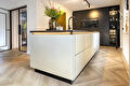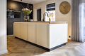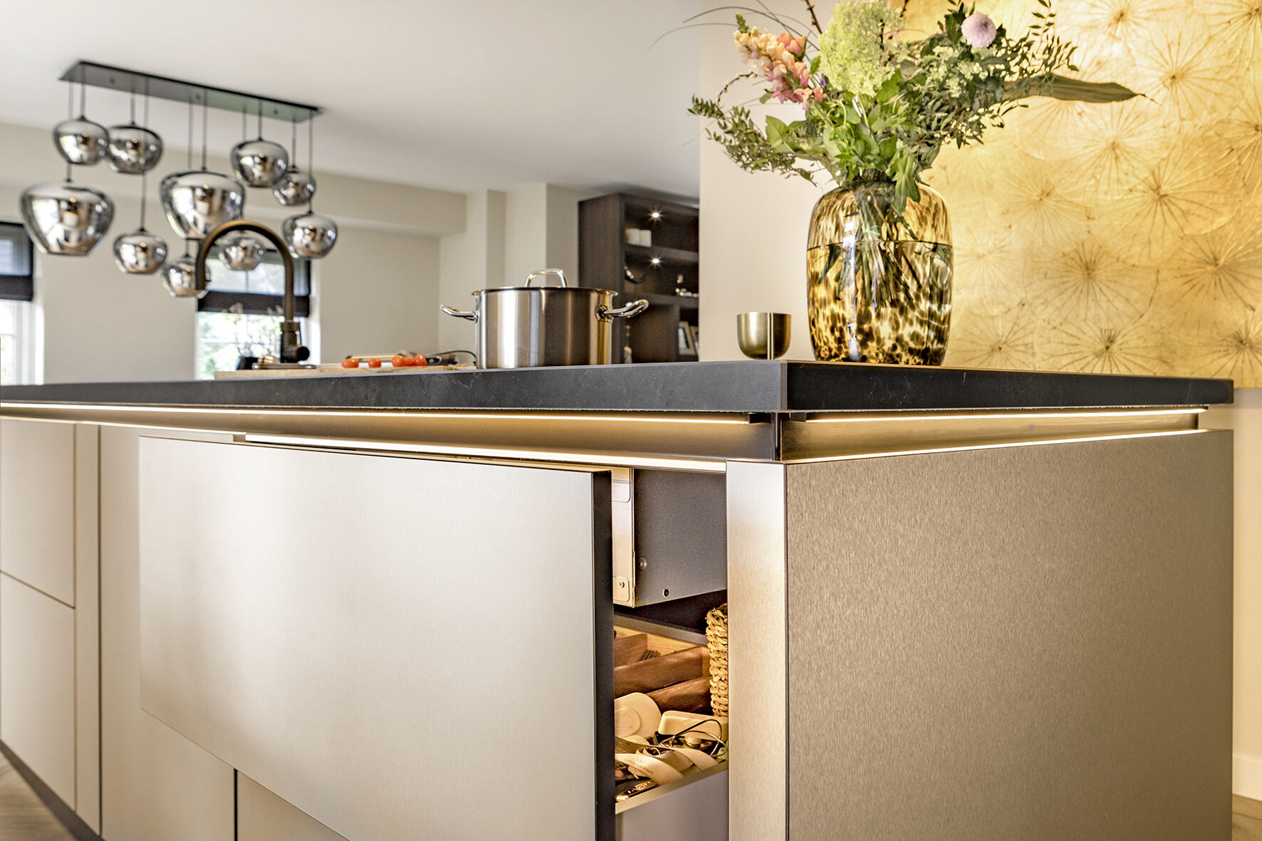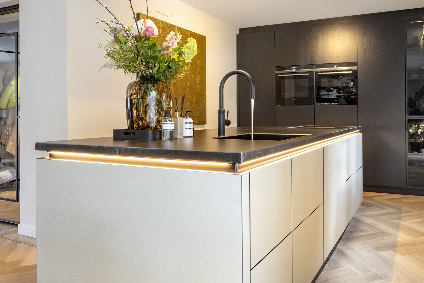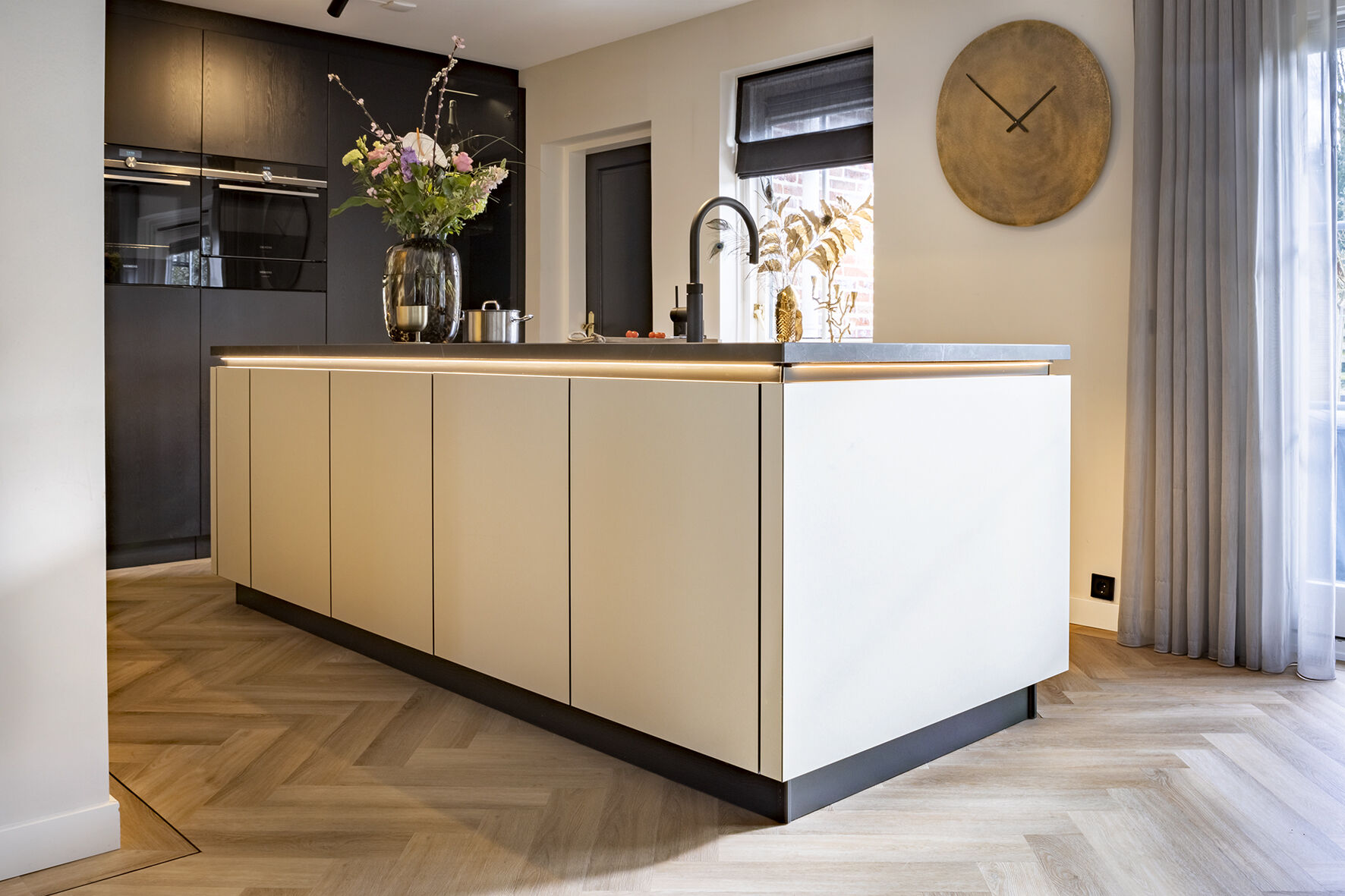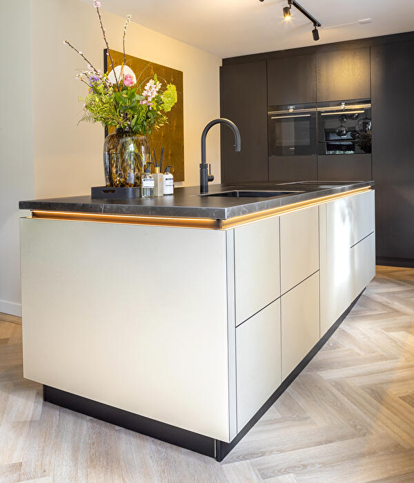 Een moodboard met kleuren en een plattegrond vormden de basis voor het keukenontwerp van dit gezin. Na een bezoek aan de showroom, waar aanvankelijk een zwart-witte keukenwens werd besproken, werd er gekozen voor een unieke champagnekleurige keuken met een warme en chique uitstraling. Henk Jan creëerde op basis van de plattegrond een 3D-ontwerp waarin alle wensen werden meegenomen, zoals een kookeiland, een indeling op basis van gebruik, greeploze deuren en lades, gewenste apparatuur, een zwart keramisch keukenblad en onderhoudsvriendelijke en krasbestendige materialen.
