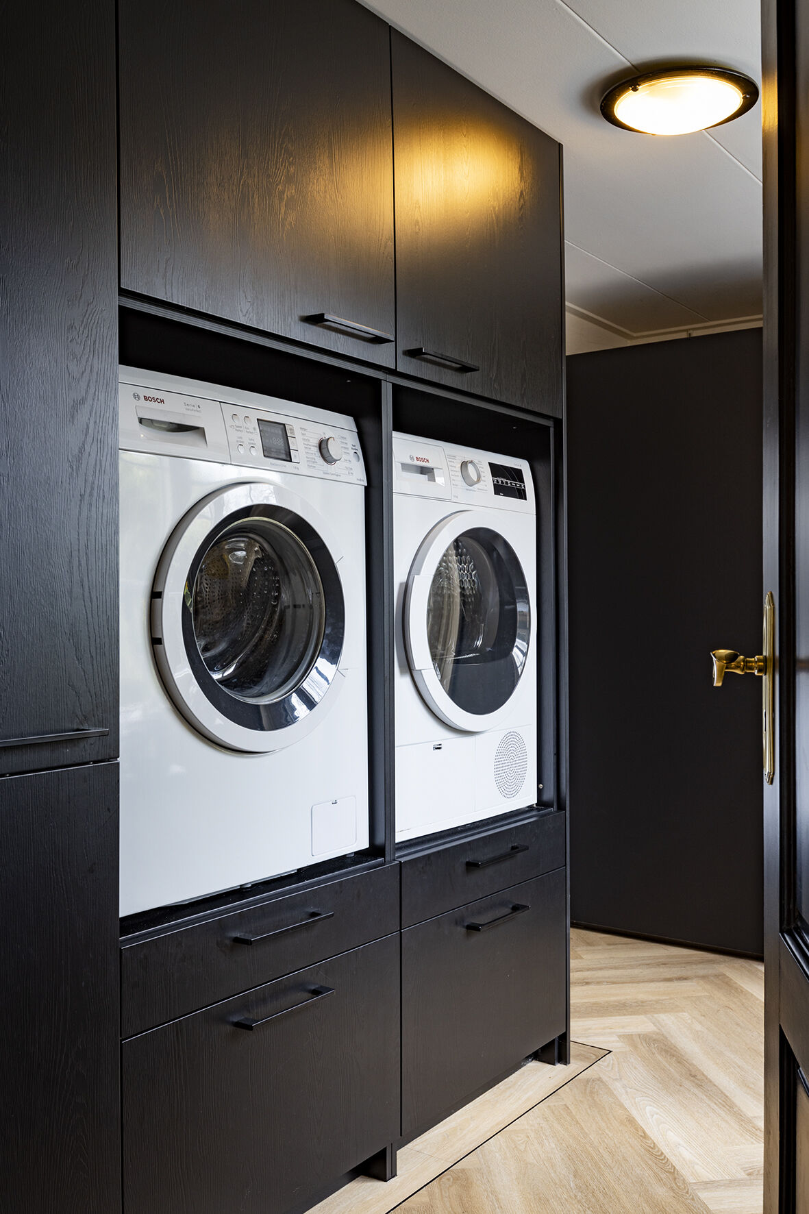 De keuken heeft een handigheidje: een handdoekenkastje. Het ophangen van handdoeken en theedoeken kan rommelig ogen, dus Henk Jan adviseerde om een handdoekenrekje naast het spoelgedeelte te plaatsen. Zo blijft de keuken zelfs met kinderen opgeruimd en stijlvol! Bovendien hebben we onze bijkeuken laten meenemen in het ontwerp, waarbij we de wasmachine en droger hebben laten inbouwen in de kasten. Er is ook genoeg ruimte voor alles wat je nodig hebt, van wasmanden tot wasmiddelen.