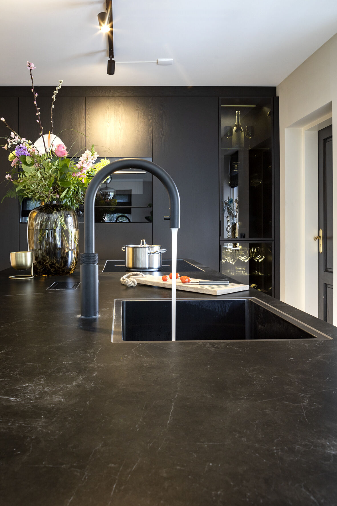 Het blijft een uitdaging om inspiratie op te doen voor keukens, gezien het enorme aanbod aan verschillende stijlen. Maar voor dit gezin uit Winschoten was de keuze al snel gemaakt. Dankzij hun eigen woonwinkel waren ze goed op de hoogte van de nieuwste interieur- en woontrends en lieten ze zich inspireren door hun klanten. In de woonwinkel was er veel vraag naar de Hotel Chique-stijl, die hen direct aansprak vanwege de gezellige, warme en sfeervolle uitstraling. Dit gevoel wilden ze ook terug laten komen in de keuken, zodat deze mooi aansluit bij de woonkamer. Door gebruik te maken van zwarte stalen deuren in zowel de woonkamer als de keuken werd er ook verbinding gelegd met de bijkeuken, wat het geheel ruimtelijker maakt.